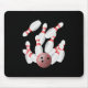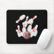 Uma ilustração vetorial de uma bola de boliche de tremoço vermelho que está recebendo um ataque.Um design divertido para os boliches. O fundo é preto e os pinos vermelho e branco estão voando no ar.
