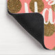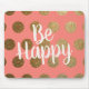 Coral com bolinhas douradas e texto cursivo branco de script, "Seja feliz", inspiracional e motivacional mousepad
