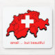 O mapa vermelho da suiça com o suíço branco cruza-a sobre. O tipo diz embaixo "pequeno… mas bonito". Uma maneira muito boa de descrever o impacto do país. .a lot of para o tamanho.