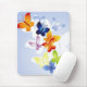 Este design gráfico multi-coloriu borboletas em um fundo azul pálido. As borboletas elas mesmas são azuis escuro, luz - azul, amarela, alaranjada, lavanda, e branco.