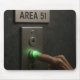 Uma mão de alienígena enrugada e marrom-escura pressiona um botão verde brilhante rotulado 'Área 51' em um painel de elevador, despertando curiosidade sobre os segredos do local