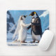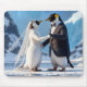 A pair of penguins is dressed in wedding attire, standing together against a snowy, mountainous backdrop.