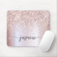Rosa Metalizado Rosa Brilho Glitter Glam Monograma Nome Script Personalizado mousepad personalizado. Estes desenhos apresentam seu primeiro nome em uma linda tipografia de letra manuscrita com cauda swash em folha metálica rosa dourada falsa com borda brilhante glitter. Estes são fáceis de personalizar. Ótimo presente feminino elegante para aniversário, dia das mães, aniversário de 16 anos, chá de noiva e é para a garota que ama coisas elegantes e brilhantes únicas.
