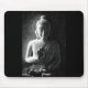 Fotografia monocromática de uma cinzeladura de madeira do Buddha de India. Foto por Caroline Webb.