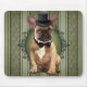 Buldogue francês da jovem corça lindo com chapéu alto, laço, e as listras verdes do vintage no fundo, pintado pelo artista Maryline Cazenave.
