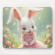 Um belo coelho branco vestido de rosa fica entre flores florescentes, encantado com as orelhas tocadas
