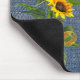Buquê de girassol amarelo amarrado com fita floral sobre fundo de denim azul. O plano de fundo pode ser alterado.