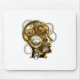 Cabeça conceitual, mecânica, humana com manômetro antigo e engrenagens metálicas contra fundo industrial das cinzas. Estilo Steampunk.