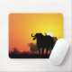 Uma manada de búfalos de Cabo em silhueta contra os incêndios do sol de pôr. Computação de Kathie Miller.