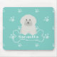 Cãozinho de papoila branca e casaco de coalhada, fofinha, e padrão de pata no monograma de fundo de aqua pastel.