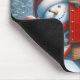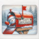 Um animado boneco de neve sai de uma caixa de correio vermelha adornada com um cartaz "Feliz Natal", cercado por uma paisagem nevada