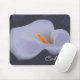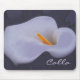 Este mousepad apresenta um lírio calla ilustrado (Zantedeschia aethiopica) em um roxo cinza mudo com um centro laranja e amarelo. Há uma área de texto personalizável no canto inferior direito em um script cursivo simples.