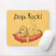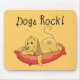 Um cão marrom bonito relaxa feliz em sua cama do filhote de cachorro e o texto preto lê "cães balança!" em nossos cães balance t-shirt, canecas, mousepads, botões, cartões, e mais!
