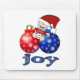 Um bebê de Natal vestido com um boné de estoque vermelho toca num casal de ornamentos de férias e o texto diz "Joy" em sacos de tote, T-shirts e outros artigos personalizáveis.