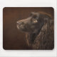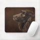 Design apresenta um retrato fotográfico de um cão com cabelo castanho sobre fundo castanho escuro.