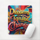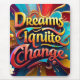 Um design vibrante com o texto "Dreams Ignite Change" em um admirável conjunto de cores, acentuado com toques de ouro que brilham como estrelas. A tipografia ousada é rodeada por abstrato e padrões giratórios, simbolizando a energia e o potencial da criatividade. Esta peça inspira os espectadores a abraçar suas aspirações e transformá-las em realidade."A Imagem Original foi gerada pelo Meta AI. A IA gerou trabalho de arte. Licenciado sob CC BY-SA 4.0.