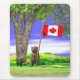 Mouse pad com meu trabalho de arte de um personagem bonitinho de castor parado debaixo de uma árvore, segurando a bandeira canadense.