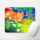 Mouse Pad com pintura de animais de Louis Wain (1860-1939). Um gato listrado de laranja anda num campo verde à noite. Flores brancas, roxas e vermelhas estão no primeiro plano. Um presente maravilhoso para amantes de gatos e arte inglesa.