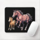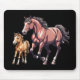 Uma representação dinâmica de dois cavalos, um maior e muscular com um homem fluente, e outro, um caule menor, ambos retratados em postura enérgica. São colocados contra um fundo branco, enfatizando suas formas fortes e seus movimentos.
