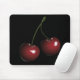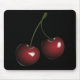 Um par de cerejas vermelhas, suculentas, deliciosas em um fundo do preto liso.