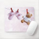 Chá de fraldas para a menina, o urso de ursinho e o pacifier no fundo cor-de-rosa