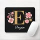 Uma bela e feminina pastilha floral cor-de-rosa, revestida de flores cor-de-rosa e de uma letra E, "faux gold monograma", num fundo preto. Personalize o mouse pad adicionando seu nome abaixo do monograma. Faz um presente divertido para um amigo ou para uma dama de damas de honra. Projetado para você pelo Blackberry Boulevard.