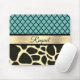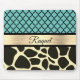 Um padrão quatrefoil em um pano de fundo turquesa junto com uma fita de ouro para personalização e abaixo que é na moda girafa impressão para vibrações exóticas de animais.