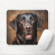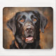 Um retrato aproximado de um Retriever Labrador de Chocolate, pintado em um estilo realista. O cachorro tem uma expressão amigável, com a língua levemente saliente e os olhos castanhos olhando diretamente para o observador. O pelo é feito com detalhes meticulosos, mostrando a textura e profundidade da casaco do animal. O fundo é um castanho macio e desfocado, criando uma sensação de profundidade e focando no rosto do cão. Presente perfeito para amantes do labrador.