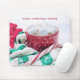 Mousepad com uma foto natalina quente e confortável. Uma xícara quente de cacau com marshmallows em uma caneca vermelha e branca de bolinhas. Uma cana de natal listrada apoiada em um cachecol verde e branco listrado coberto de neve. Ahhh, uma bebida quente depois de entrar no frio é realmente o que precisamos. Uma foto festiva de Natal. Desejos de Natal Quente escritos em uma fonte moderna simples e clássica.