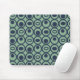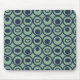 Este mouse pad tem um design geométrico de círculos em filas com círculos ou ovais dentro a azul em um campo verde.