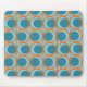 Este mouse pad tem um médio moderno século design de círculos laranja abertos com círculos teóricos sólidos atravessando o padrão com linhas verticais lacrimogêneas e linhas horizontais laranja em um campo de chá.