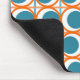 Este mouse pad tem um médio moderno século design de círculos laranja abertos, com círculos teóricos sólidos que atravessam o padrão com linhas verticais lacrimogêneas e linhas horizontais laranja.