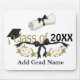 Classe de design de qualquer ano com relevo de fita preta e de flor para o Formando clássico. Design tem texto preto e ouro e flores brancas com Mortar e diploma. Personalizar a área Nome e ano.