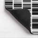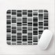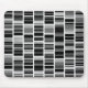 Um desenho abstrato digital composto por oito colunas de bares de espessura variada em diferentes tons de cinza. Talvez reminiscente de códigos de bar, estratos em rocha ou camadas de páginas de um livro, ou até como se poderia imaginar trilhas de dados em um disco. O que torna um design atraente e moderno bastante apropriado para um mouse pad.