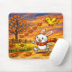 Uma ilustração alegre de outono com um coelho branco feliz com um cachecol xadrez correndo por uma trilha rural, com folhas de outono rodopiantes, um pássaro amarelo cantando, flores brilhantes, uma cerca e um céu de pôr do sol brilhante.