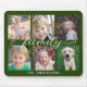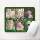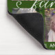 Este simples mouse pad oferece 6 fotos para você adicionar suas fotos favoritas de membros da família. O fundo é verde-escuro e pode ser alterado escolhendo personalizar. A caligrafia de estilo manuscrito de tendência diz: "família" O texto personalizado permite adicionar seu nome de família e ano.