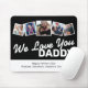 Um tapete de mouse com foto de dia de os pais, com tema preto e branco, 5 fotos da família quadradas, um design tipográfico moderno "nós amamos você pai" e os nomes das crianças.