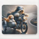 Collie com pelo fluido anda numa moto clássica com um carregando acoplado a carro alegre