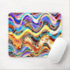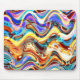 Uma caixa de mouse pad com um desenho abstrato colorido composto por uma mistura de cores onduladas giratórias.