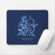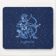 Mouse pad no símbolo zodíaco de Sagitário em azul-prata-suave, sobreposto às estrelas da constelação, contra um fundo céu estrelado de azul-da-meia-noite profundo