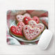 Os biscoitos em forma de coração, com cobertura cor-de-rosa e vermelha, são enfeitados com pequenas borrachas decorativas