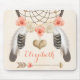 Um lindo cora, mousepad floral cor-de-rosa e de creme peachy do dreamcatcher do monograma com os rosas, os cravos e as penas pendurando de um coletor do sonho do estilo do nativo americano com a miçanga dada forma coração dada polimento do ouro. Pode monogrammed com sua inicial no encanto dado forma coração que pendura de uma corrente. Um fundo e o falso do olhar do pergaminho brilham seta do olhar com uma cabeça dada forma coração da seta terminam este design bonito, tribal e boho inspirado. Por favor, a nota, nenhuns enfeites 3D foi adicionada a este travesseiro. Os trabalhos de arte foram criados para simular o olhar do brilho, da gravação e do brilho. Isto faz um material de escritório temático boémio bonito e feminino, feminino. Design e/ou © Chrissy H. Estúdio dos trabalhos de arte, LLC. Todos os direitos reservados.