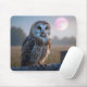 Uma coruja majestosa pisca em uma cerca de madeira sob o brilho de uma lua de tinta cheio, cercada por uma paisagem suave e suave