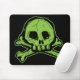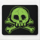 Um gráfico scribbly verde e preto de um crânio e de crossbones.