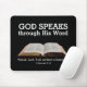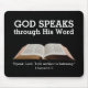 MOUSE cristão personalizável moderno PAD, mostrando a imagem de Bíblia aberta contra um fundo preto rico. As palavras DEUS FALA ATRAVÉS DE SUA PALAVRA aparecem em tipografia branca ousada, com um verso Bíblia e uma referência Bíblia - Fale, Senhor, Seu servo está ouvindo, baseado em 1 de Samuel 3:10. Todo o texto é PERSONALIZÁVEL, para que você possa personalizar com seu próprio verso de script favorito e/ou adicionar seu nome. Você também tem a opção de adicionar um monograma (até quatro caracteres), que aparecerá no centro em uma cinza em negrito. Outros itens semelhantes estão disponíveis no DGOD HAS A ÚLTIMA coleção SAY por Designs Bereanos. Vem em cores diferentes.