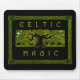 Cercada por uma borda de nós celtos, uma floresta mística estilizada e cavaleiros em tons de verde.