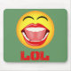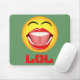 Rosto Sorridente © Designs Sunny Mars. Esta legal, humorística, divertida, mouse pad ou mouse mat apresenta uma ilustração engraçada de um emoticon amarelo risonho com uma boca grande aberta, dentes claros brancos de pérola, língua e olhos fechados, com a sigla "LOL" abaixo, que significa Rir alto abaixo dela. Conceito de humor.