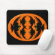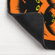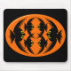 Este malvado dourado do Halloween apresenta um oval laranja com seis corvos. Cada corvo tem olhos amarelos com pupilas pretas e asas salientes. Os corvos voam em direção uns aos outros formando uma forma oval. O fundo é preto.