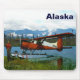 Um piloto de arbusto fica perto do seu flutuador de Havilland Canada DHC-2 Beaver na costa de um lago no extremo norte; montanhas e árvores estão à distância. A leitura de texto "Alaska" também é exibida. Esta imagem foi derivada, em parte, de uma foto do Serviço de Pesca e Vida Selvagem dos EUA.