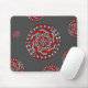 Este design de círculo concêntrico contém camadas de padrões geométricos que se assemelham a engrenagens que você pode encontrar em máquinas modernas ou até alienígenas, em tons de vermelho e cinza.